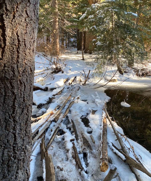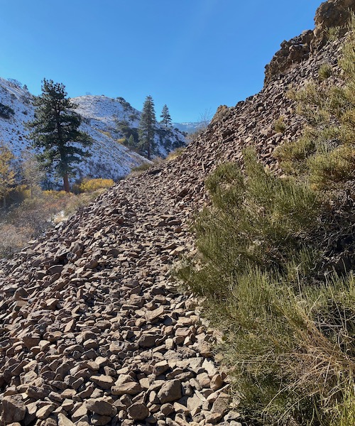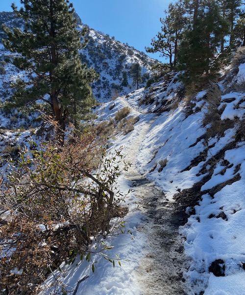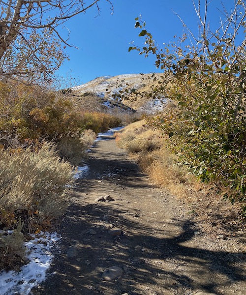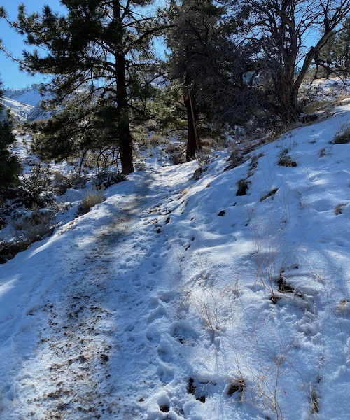 We had a good snow a week ago, so the further up the trail you get, the more snow there is. Mostly on the western slope of the trail. The eastern exposure sees out the canyon to Reno and gets plenty of light. The western exposure is the side of the mountain. Add a few trees for shade, and you have snow cover.