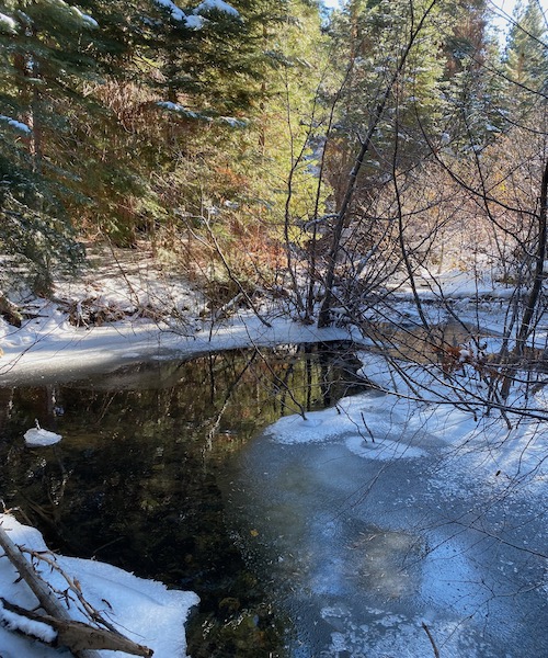 This time, when I got here this was in snow, which was actually a good thing because someone had drug a small tobagan to pack down the trail. It was easy to see, but not so easy to traverse. At the top of the hill I had the choice of trying to traverse this group of snow and ice covered saplings or decide to call it quits. The creek is running under them. Since at this point, I still had no idea how much farther I really had to go and had still planned on only 2 1/2 miles, I decided to call it quits.